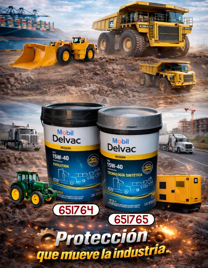 - Mobil Delvac Modern 15W-40 Evolution (Cod. 651764): Una fórmula de alto rendimiento que mantiene la viscosidad estable incluso en las jornadas más largas. Es el aliado perfecto para quienes exigen el máximo de sus equipos pesados.
